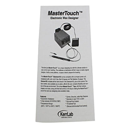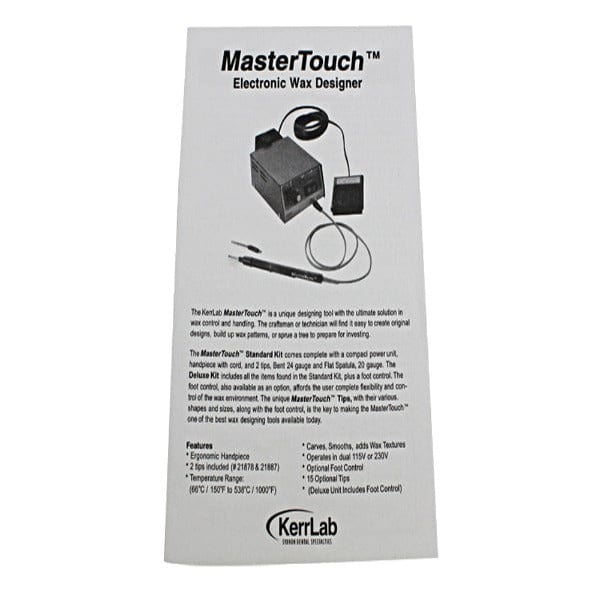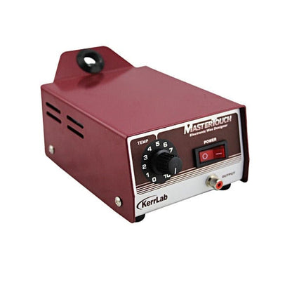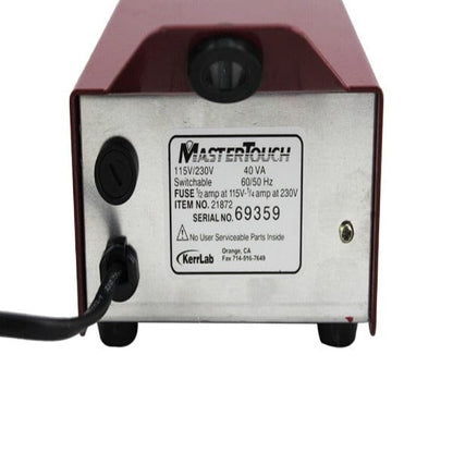 The Kerr master operates on either 115 v or 230v which can be selected from a switch on the back panel you must change the fuse when switching voltage use a 1/2 amp fuse at 115V and a 1/4 amp fuse at 230V. The unit will operate on 60 or 50 cycles, with no adjustment needed.to operate the unit on a 230V setting .it will be necessary to change the power plug or use an adapter plug Plug the Master Handpiece into the output connector on the front panel of the face of the power unit is used to turn the unit on the switch lights to indicate that power is on and that the tip is heating