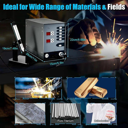 The Automatic CNC Touch Pulse Argon Arc Tig Jewelry Spot Welding Machine is designed for precise welding of various materials, including hardware, jewelry, dental tools, molds, and precious metals such as gold, cobalt-chromium, and titanium. This advanced welding machine utilizes pulse-dense arc technology, delivering efficient and cost-effective results that rival traditional laser welding machines. It features five preset basic procedures for various materials and is stable, low-noise, and easy to maintain. Plus, its small footprint makes it a practical option for any workspace. With adjustable power and pulse settings, users can control the penetration depth and solder joint diameter with precision. Additionally, the machine has an auto-deactivate feature after five minutes of inactivity, preventing any potential damage to the workpiece. It's the ideal solution for jewelry and dental welding needs.